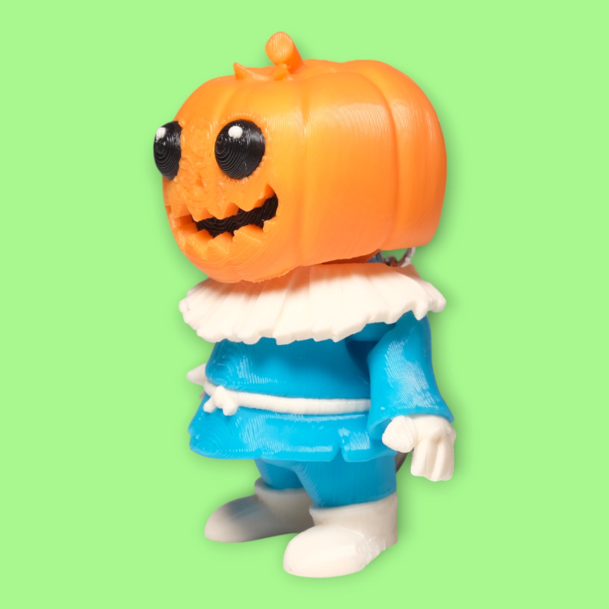 - Eğlenceli Tasarım: Klasik balkabağı kafası ve mavi palyaço kostümüyle (Pumpkin Jester) tasarlanmış sevimli figür.