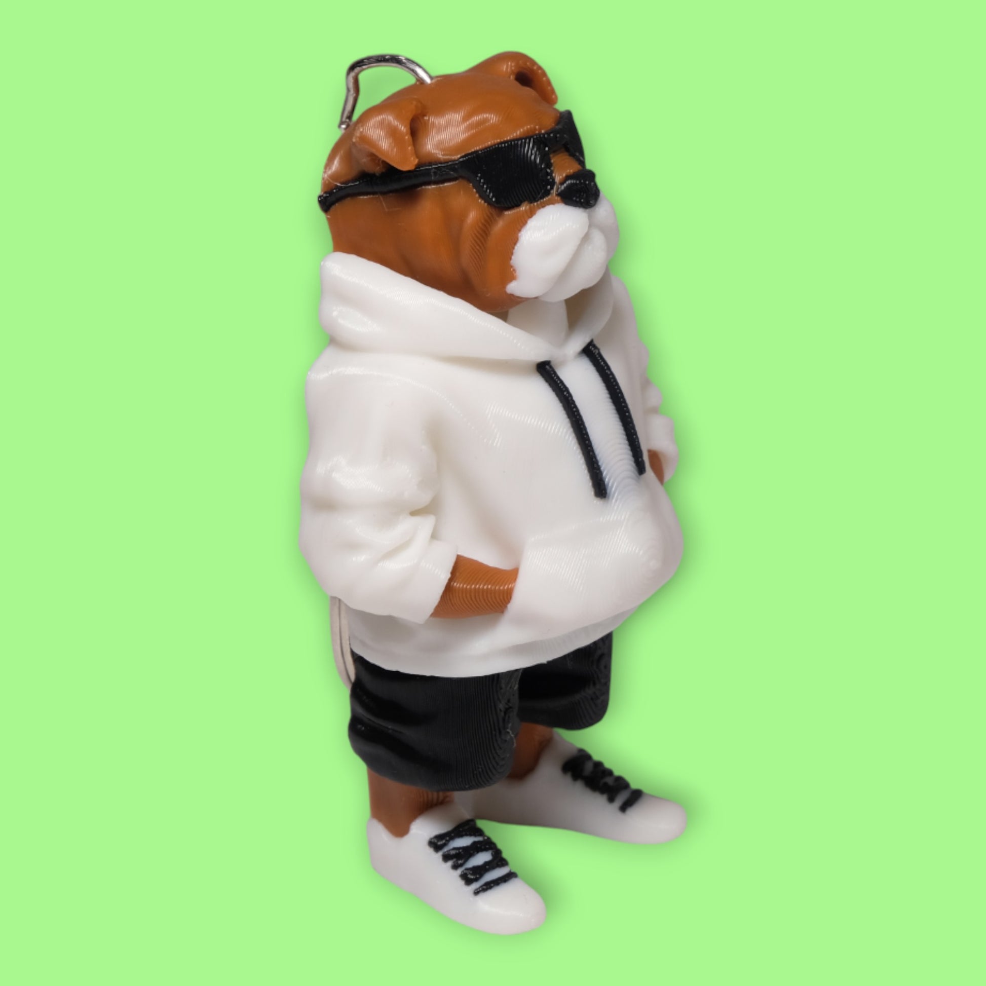 - Havalı (Cool) Tasarım: Beyaz hoodie, siyah şort, spor ayakkabı ve güneş gözlüğü detaylarıyla modern sokak tarzını yansıtan bulldog figürü.
